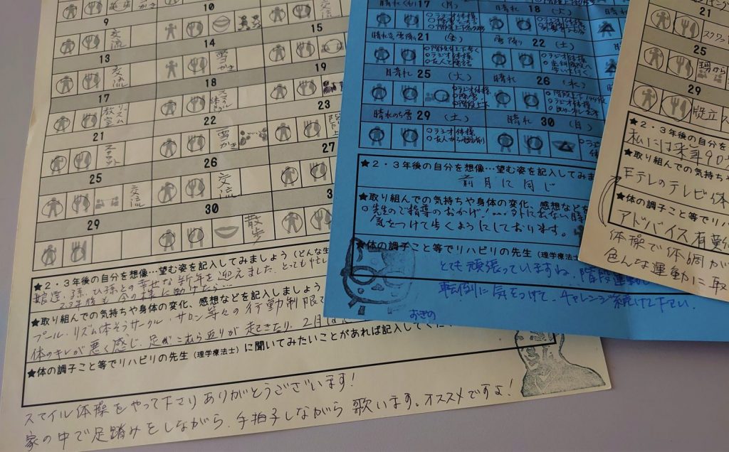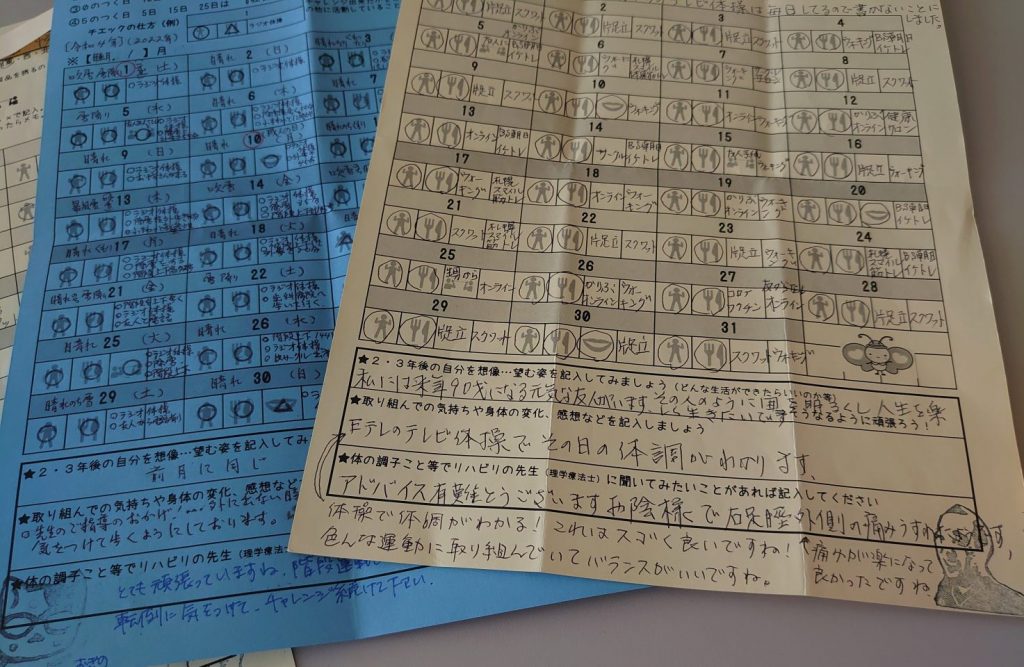 提出頂いたチャレンジ表は全てコメントを記入しお返ししております。運動や身体の動きに関する質問等があれば理学療法士の須川先生からアドバイスを頂いております。
