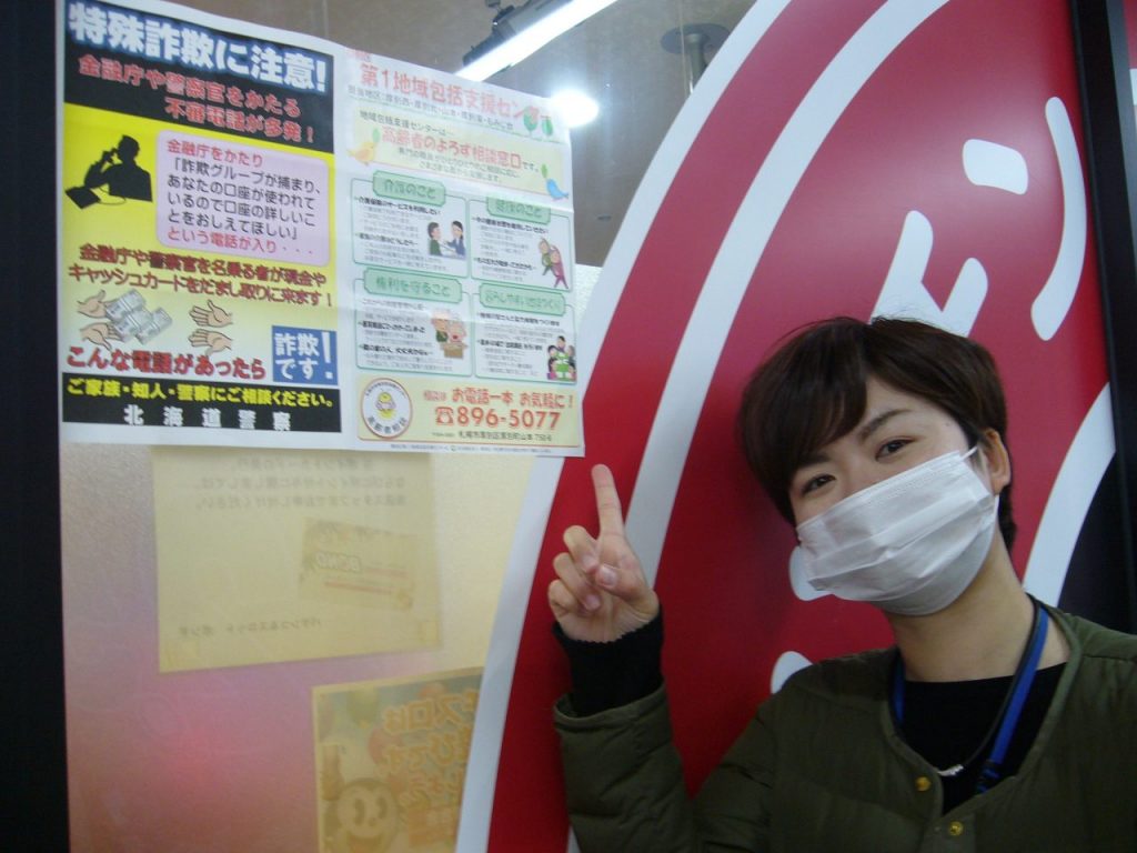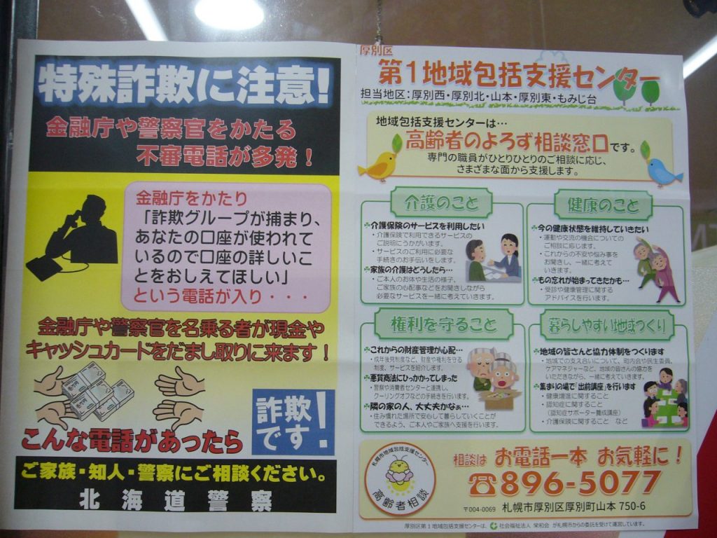 ホクノースーパー中央店にご協力をいただき、ATMの周辺で、特殊詐欺防止のチラシと厚別区第1地域包括支援センターのチラシを配布しました。