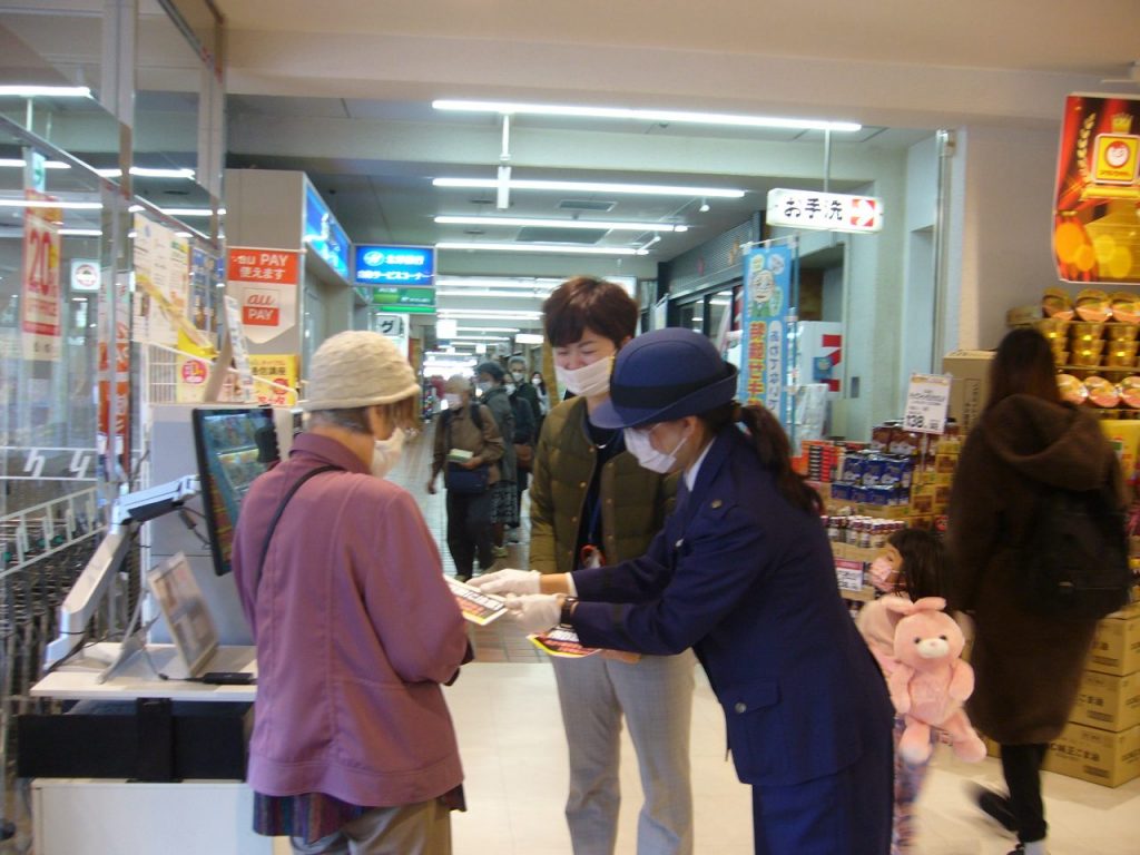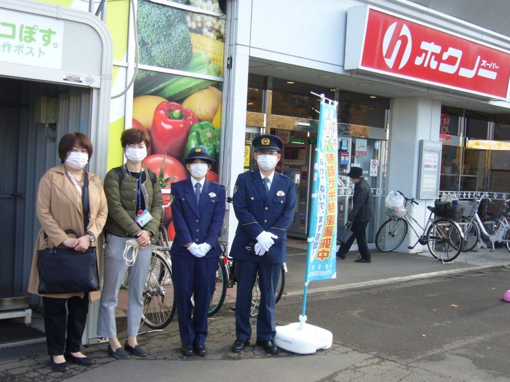 10月に引き続き、11月1日に厚別区第1地域包括支援センターの職員と厚別警察署生活安全課の警察官の方々で、もみじ台にあるホクノースーパー中央店にて詐欺防止の啓発活動を行いました。