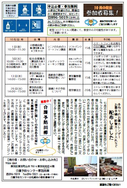 ご興味のある教室がありましたら、当センターまでお申込みください。コロナ禍のため、中止や延期となる可能性もありますのでご了承願います。