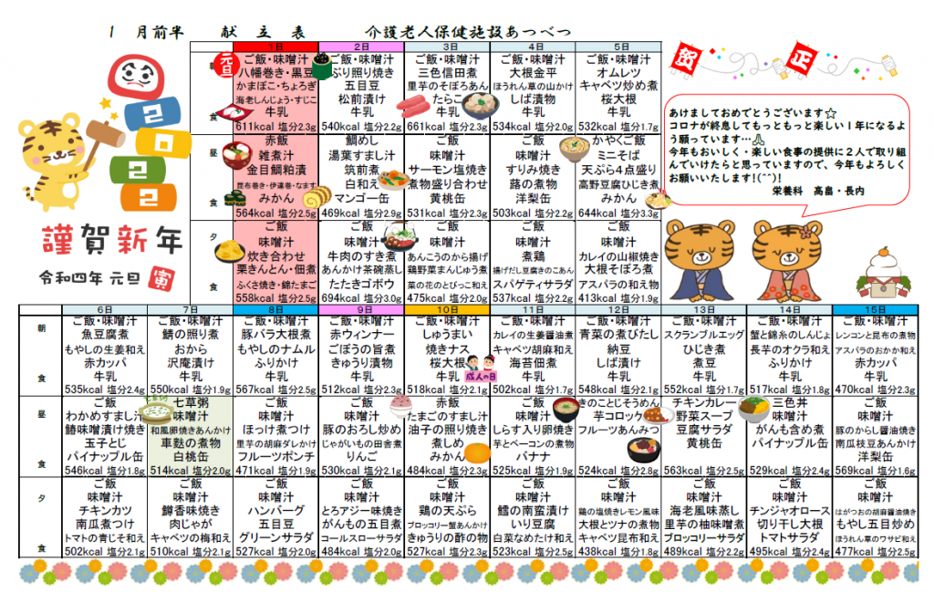 2021.12.22 老人保健施設 あつべつ 1月献立表? 今年もあっという間に1年が経ちましたね(゜-゜)1月の献立表が出来ましたのでご覧ください☺2022年度もよろしくお願いいたします?✨ 令和4年 1月献立表ダウンロード 令和3年度認知症サポーター養成講座のお知らせ(再) 前の記事 冬のスイーツデイ⛄ 次の記事