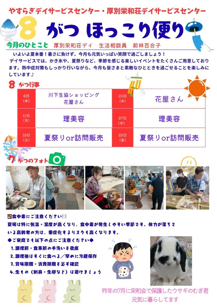 2025.08.04 特別養護老人ホーム 厚別栄和荘 8がつ ほっこり便り 熱い日が続きますがデイサービスのお祭りや行事を楽しんでいただいております。 やすらぎ 主任カイマイ 厚別区、白石区の一部の方々にデイサービスセンターを楽しくご利用頂けるように、毎日笑顔をモットーにしております! ひらおか梅花実 しゃんこ♪しゃんこ♪♪ 前の記事 デイサービスセンターあつべつ南5丁目 「あつなんだより8月号」 次の記事