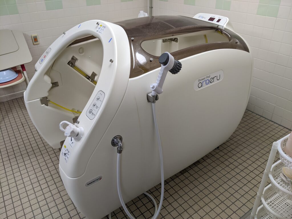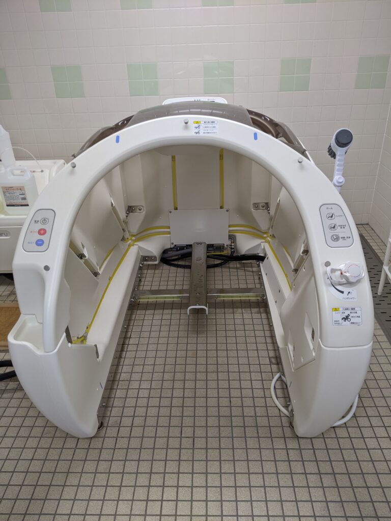 新しい浴槽は『ミスト浴』と呼ばれる浴槽です。短時間で保温、保清などが可能で、身体的な負担が少なく、また温かいサウナのような状態でリラックス効果も期待できます。