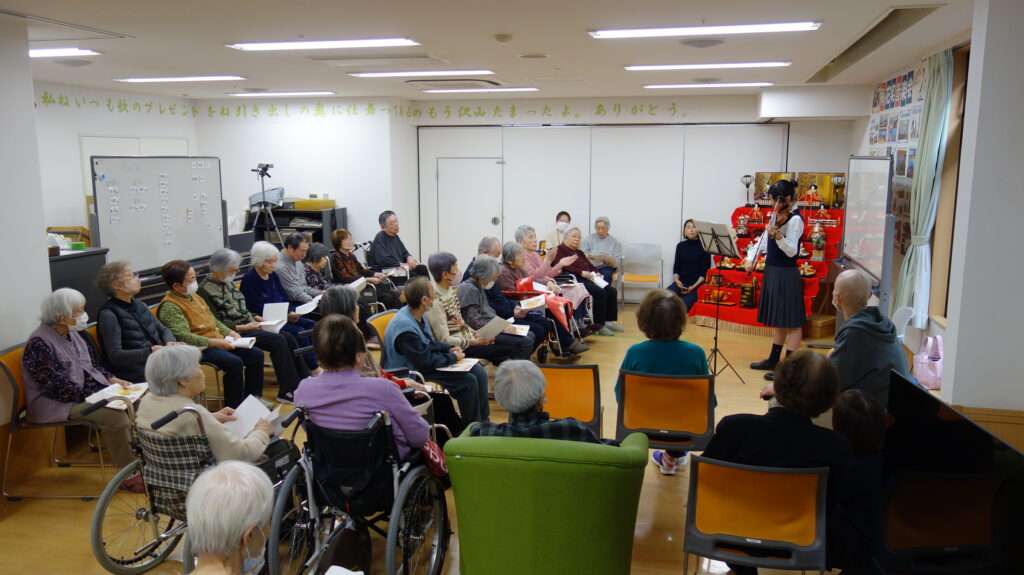 お問い合わせをいただいたのはご家族からでしたが、「音」で輪を広げ、みんなとつながりたいとの想いから、今回のように数件の施設で活動をされているようです。素晴らしい想いだと思います。(うちの中学3年生の長男にも聞かせてやりたいもんです。同じ中学生とは思えない…)