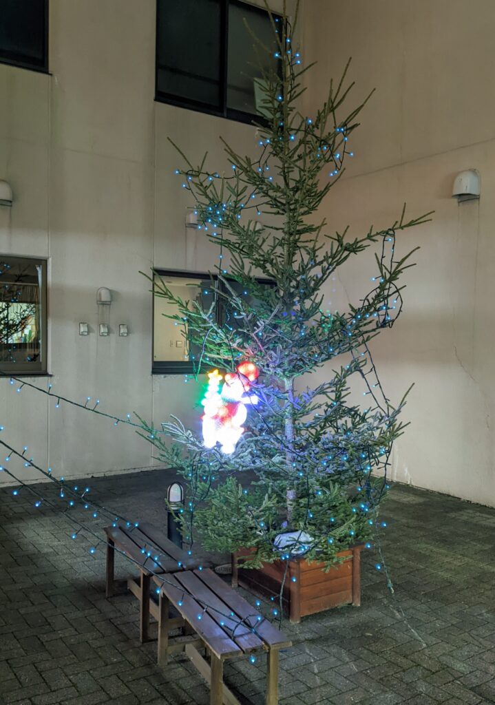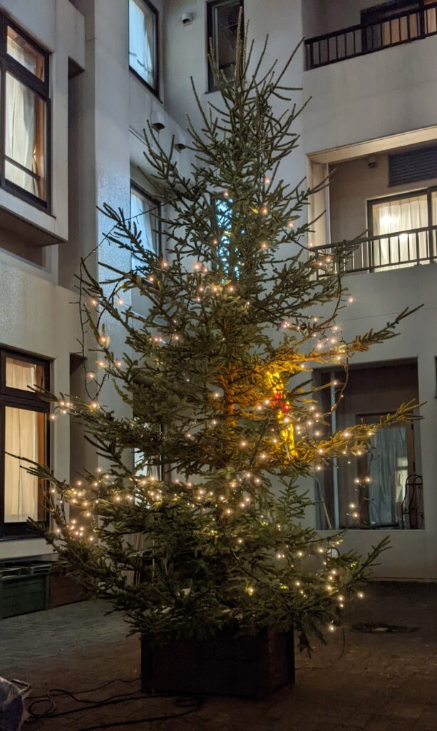 なんと!中庭に木が生えました!?ゆうに3~4mはある立派な木♪そこに電飾が飾られていきます~。夜の中庭をとってもきれいに彩ってくれています。