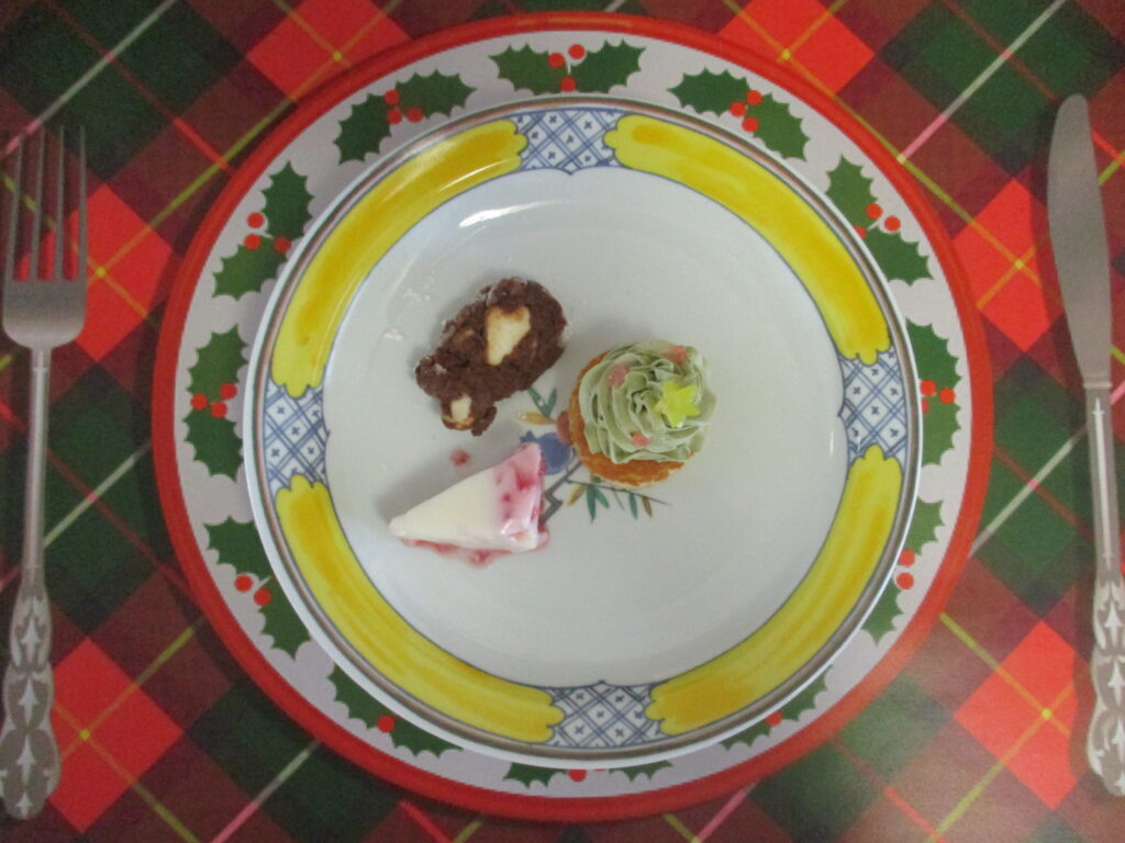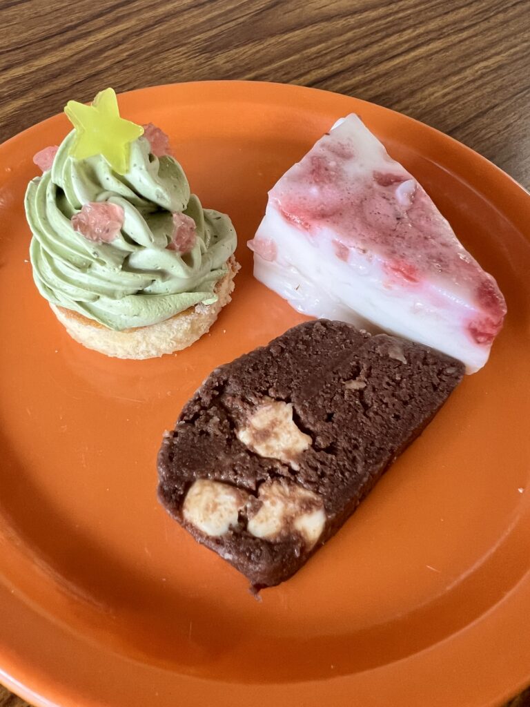 ツリー風ケーキや、外国のクリスマス菓子をアレンジしたチョコレートなど3種類のデザート盛り合わせを提供いたしました。