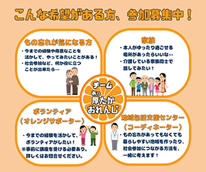 そして令和6年度は、新しい取り組みとしてチームオレンジの取り組みが始まり、その後「厚たかおれんじ🍊」と命名した常設の場(認知症の方やその家族、支えるサポーターがあつまる場)が毎週木曜日13時30分より開催することになりました。