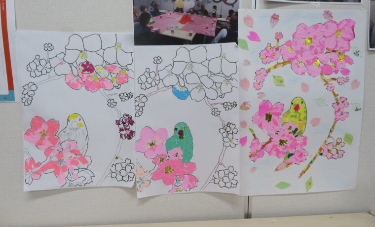 3つ程のグループに分かれて、ちぎり絵「さくらと鳥」を実施致しました♪
