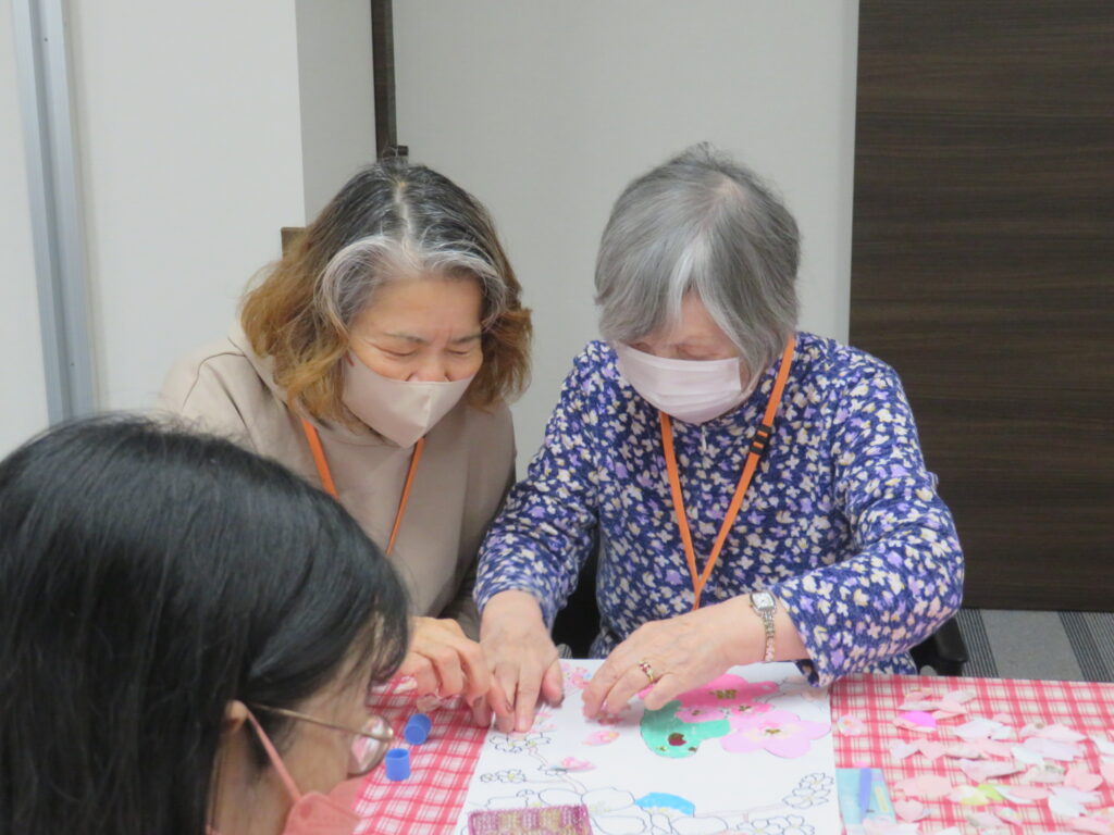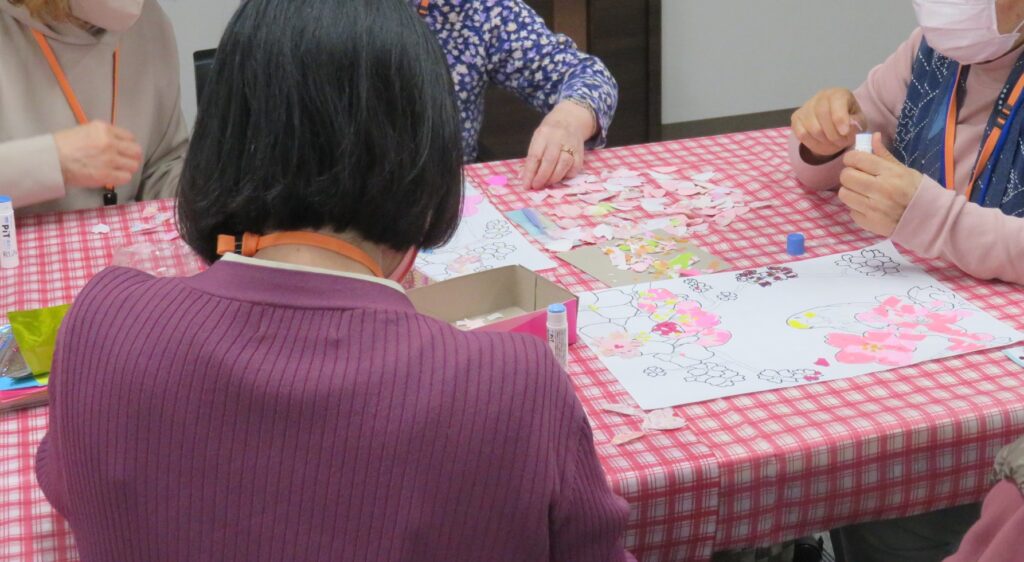 春にちなんで桜の貼りえを実施致しました!この鳥はいんこ?うぐいす?などと盛り上がりながら、各々の作品を自身のペースでゆっくりと作成していきました♪