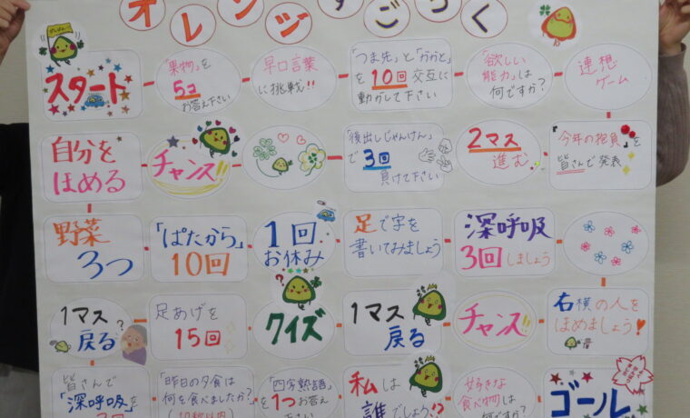 マスの中には、脳トレお楽しみとして「この人は誰でしょう!?」や「自分や相手をほめる」介護予防として「足上げ15回」等の内容を盛り込み実施を致しました。