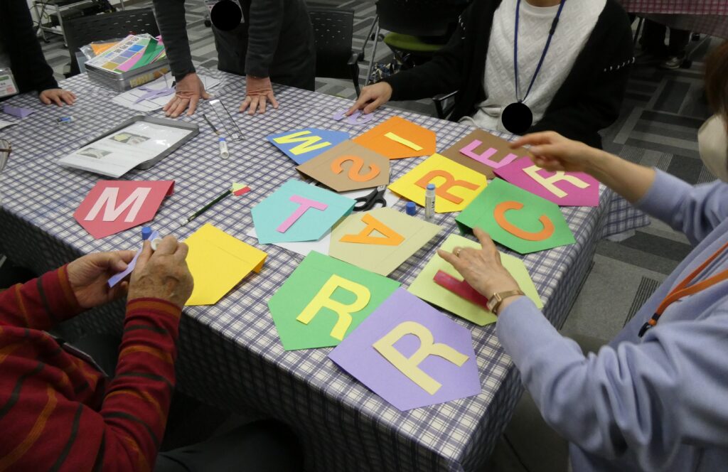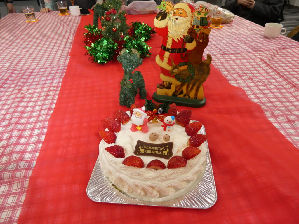 完成した作品を会場に飾り付け、ミニビンゴ大会を楽しんだ後は、イチゴのホールケーキを囲んで和やかなひとときを過ごしました!