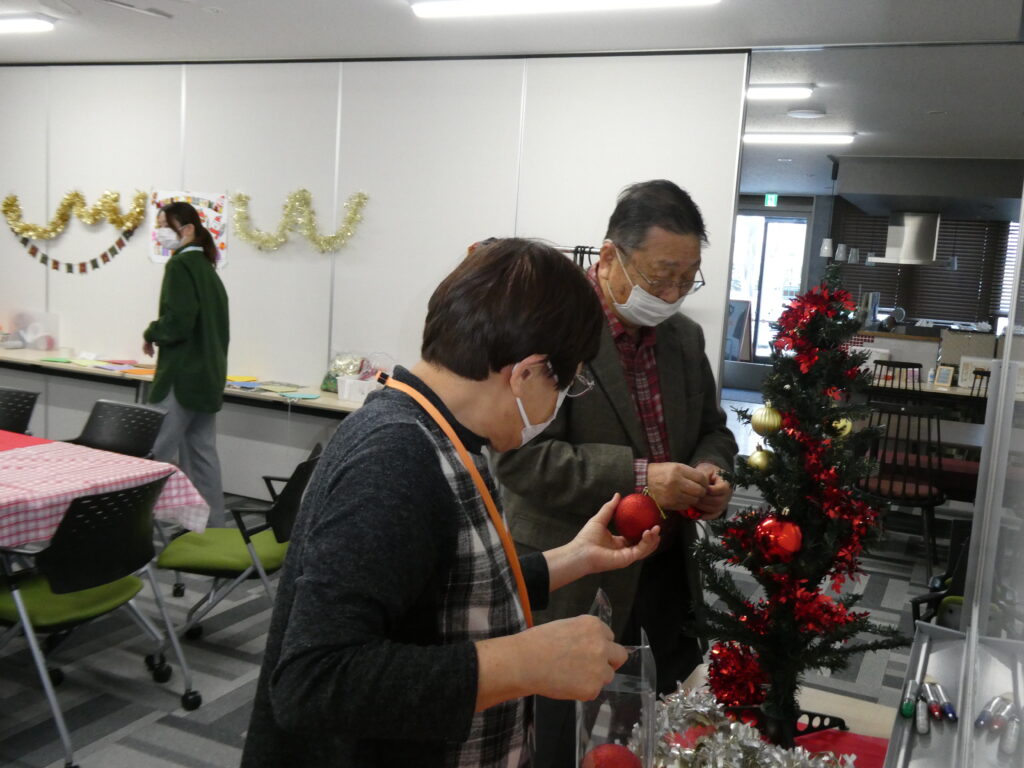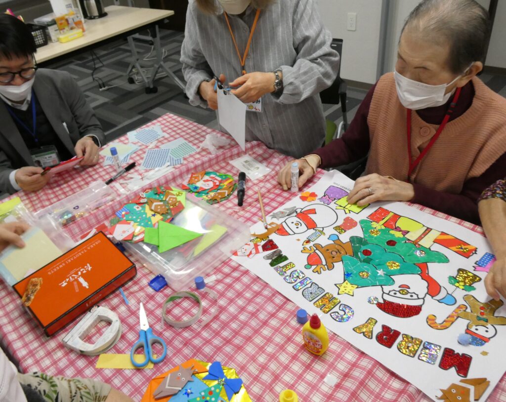 この日に向けて、参加者の皆さんと一緒にクリスマスのちぎり絵やガーランドを作成。