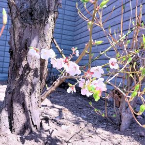 もうひとつ。正面で元気に咲いている紅梅の根元に、小さく白梅の樹が伸びていて少しだけ花を咲かせています。(恐らく落ちた種から自然に伸びたと思われます。)