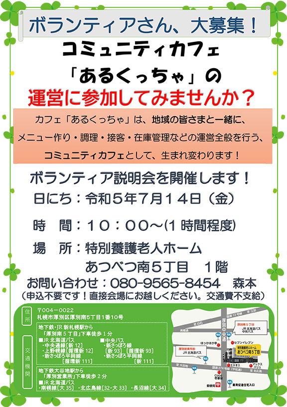 特別養護老人ホームあつべつ南5丁目に併設しているカフェです。 ▶▶▶ カフェあるくっちゃからのお知らせ 現在発生している新型コロナウイルスの感染拡大防止のためカフェを閉店しておりましたが、 2023年8月中旬頃に再開できるよう準備をすすめております。 えいちゃんカフェ「あるくっちゃ」は、地域の皆さまと一緒に、メニュー作り・調理・接客・在庫管理などの運営全般を行うコミュニティカフェとして、生まれ変わります!ボランティアさんも募集中です!お気軽にご連絡ください。